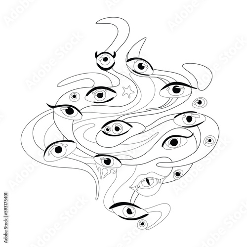 Psyhodelical Pattern with Thousand Eyes, Witchcraft Vibes. Surreal Design. Pop Art Cartoon Style. Pop Art Cartoon Style with Abstract Stains. Vector Contour Illustration. Coloring Book