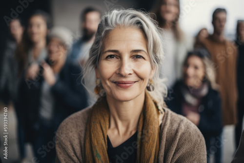 beautiful woman life coach in a humanitarian and philanthropic setting, wearing casual and comfortable clothes, surrounded by people of different ages and backgrounds, generative ai