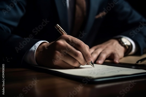Close-up photo of a businessman's hand signing a contract with a ballpoint pen