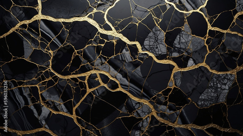Black marble mosaic with golden veins, japanese kintsugi technique, fake painted artificial stone texture, marbled wallpaper. Generative AI