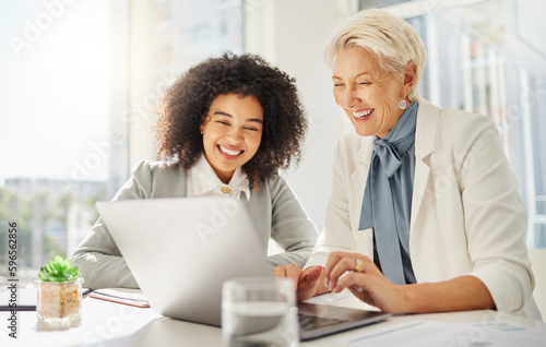 Office laptop, happy diversity people and mentor training onboarding woman on company system, software or work. Collaboration, team and senior business person working, teaching and coaching trainee
