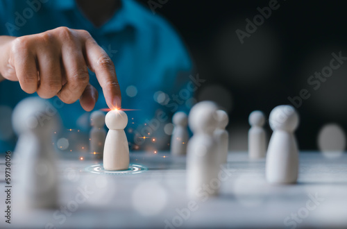 Businessman choosing wooden figure hiring, business tactics and strategy. Leadership of business success. Organization development. Personnel selection. Human resource management concept.