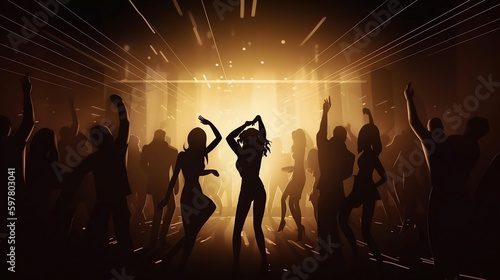 Young happy people are dancing in club. Nightlife and disco concept, generative ai