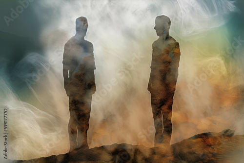 Two distant figures standing side by side a simmering hostility detectable beneath the seemingly congenial Psychology emotions concept. AI generation. Generative AI