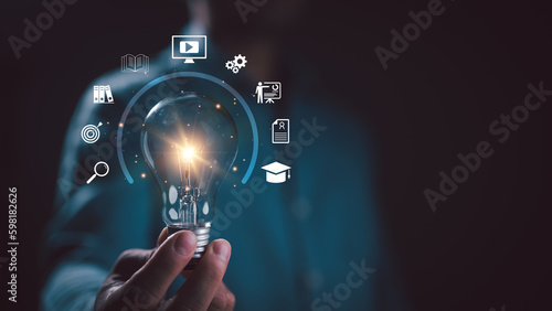 E-learning graduate certificate program concept. man holding lightbulb showing graduation hat, Internet education course degree, study knowledge to creative thinking idea and problem solving solution