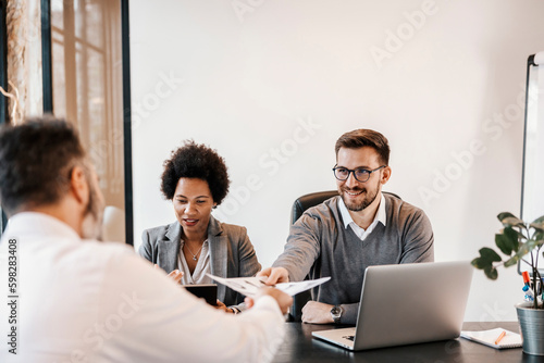 The multicultural businesspeople are sitting at the corporate firm and having job interview on position of senior developer.