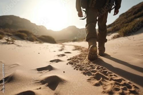 Walking on Socotra's Sands. The untouched splendor of Socotra as a trekker embraces the breathtaking coastline in this captivating low-angle shot. Yemen Beach Indian Ocean AI Generative