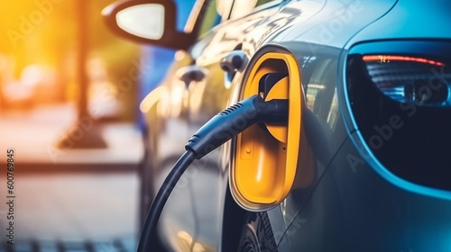 The driver of the electric car inserts the electrical connector to charge the batteries. Close-up. Generative AI
