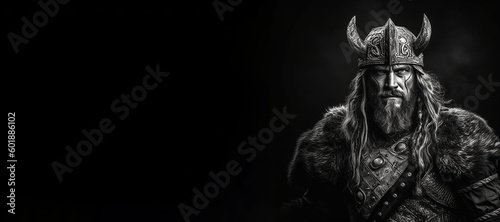 Black and white photorealistic studio portrait of a viking warrior on black background. Generative AI illustration