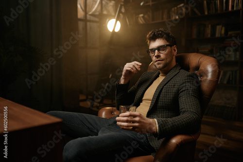 Portrait of young adult elegant gentleman drinking alcohol rest in armchair