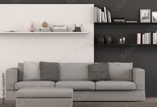 Modern Living Room Interior with Gray Sofa and Decorative Shelves