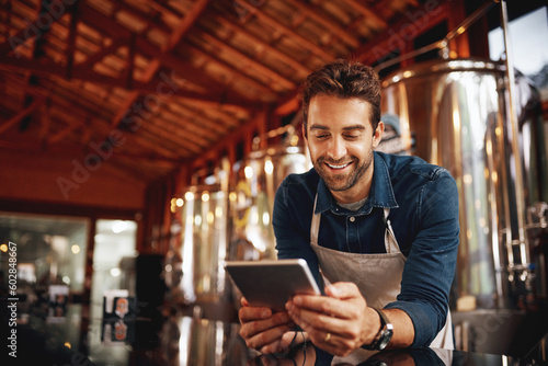 Tablet, beer and brewery with man in factory for production, manufacturing and alcohol fermentation. Technology, inspection and digital with business owner for distillery, storage and quality control