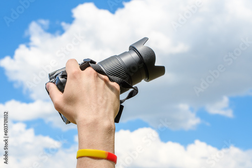 Dłoń trzymająca aparat fotograficzny na niebieskim tle chmur na niebie