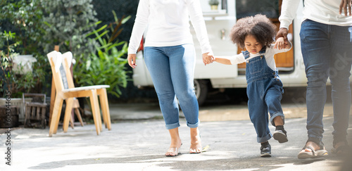 Smiling biracial child and family have fun together outdoors. Portrait of father and Asian mother happy leisure playing with cheerful multiracial daughter in backyard. Kid enjoying childhood laughing.