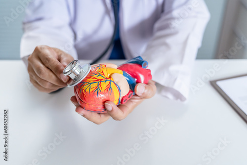 Doctor with anatomical model of human heart Cardiologist supports the heart. heart diagnose medical checkup cardiologist in examination room