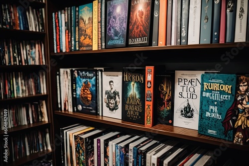 a shelf filled with books of all genres, including fiction, nonfiction and graphic novels, created with generative ai