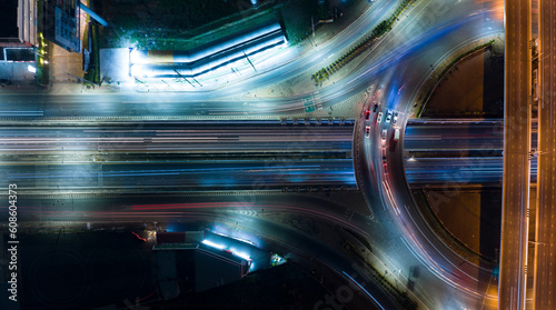 Expressway top view, Road traffic an important infrastructure, car traffic transportation above intersection road in city night, aerial view cityscape of advanced innovation, financial technology