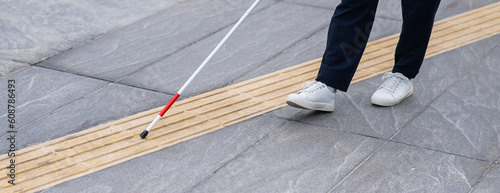 Close-up of the legs of a blind businesswoman walking along a tactile tile with a cane. Widescreen.