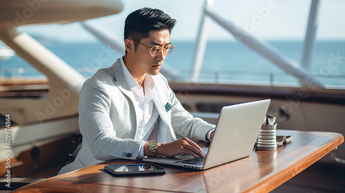 A fictional person. Serene Businessman Working on Laptop Aboard Luxurious Yacht