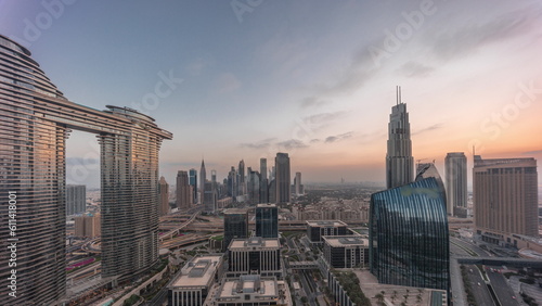 Futuristic Dubai Downtown and finansial district skyline aerial night to day timelapse.