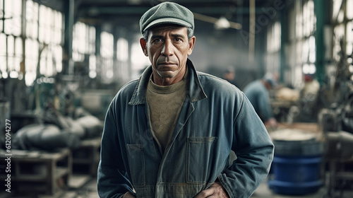old man with gray hair and mustache, front view, fictional place, old machines with steam and smoke and smoke, production, obsolete engineering and technology