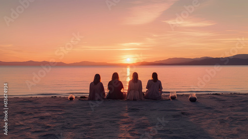 Przyjaciółki siedzą na plaży i oglądają wschód słońca. Romantyczny klimat.