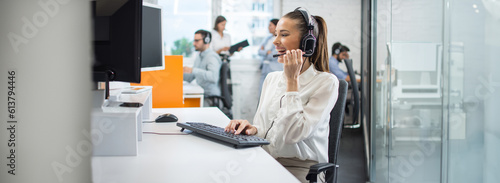 Smiling businesswoman using computer and listening to client via headset in call center office. Panoramic view.