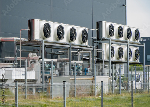 Przemysłowy układ chłodniczy. Zdjęcie skraplaczy z wentylatorami