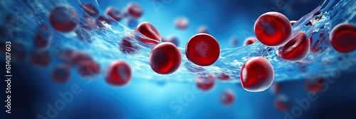 microscopic view of red and white blood cells flowing in a vein, symbolizing hematology and health, on a deep blue background