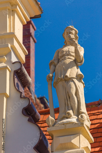 Figura na budynku Domu Wagi Miejskiej w Nysie.