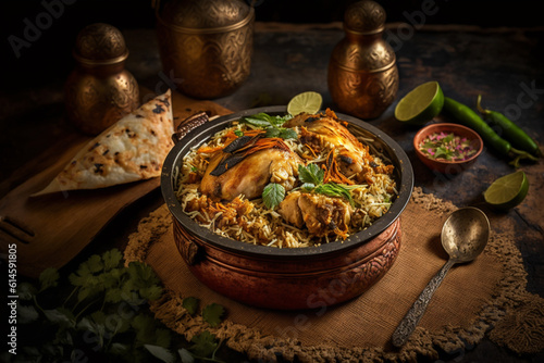 Bengali Chicken Biryani: Mildly spiced, succulent chicken with fragrant basmati rice and aromatic spices chutney and papadum for a delightful meal. Generative AI.