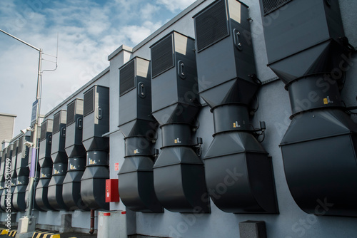 blaszane zakończenia przewodów wentylacyjnych na ścianie budynku.