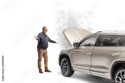 Shocked mature man standing in front of a SUV with smoke coming from the hood