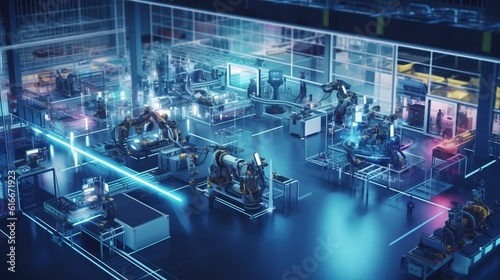 Industry. Smart factory interior showcases machines, efficient workstations, and automated production lines, optimizing the manufacturing process for improved performance. The concept of optimal work