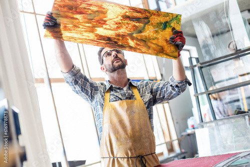 Artist examining stained glass in studio