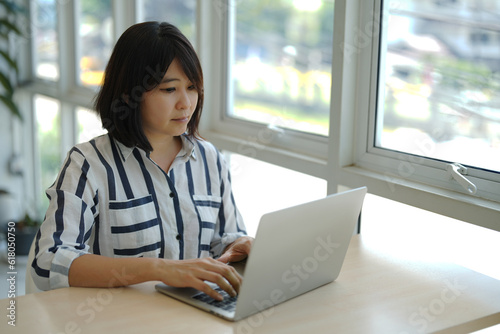 An Asian woman is working on a laptop seriously for business jobs in a cozy room.