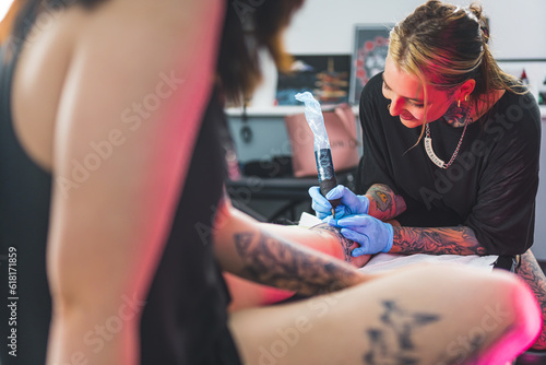 tattoo artist applying ink on a customer's body, tattoo-making process. High quality photo