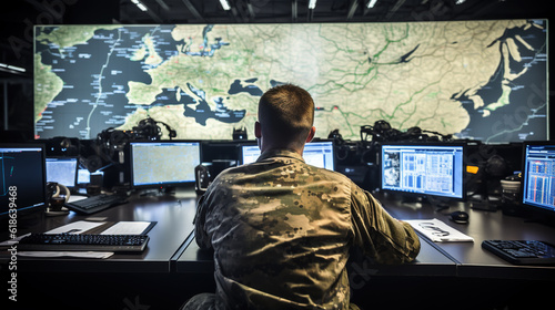 #1492752601Soldier looking at screens in command center housing operational missile defense system designed to intercept ballistic rockets. Tracking equipment operator using radar systems