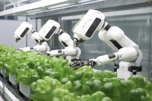 Robots Lettuce Plants in Lab Futuristic Robotic Farmers Transforming Agriculture with Advanced Technology Farm Automation Generative AI