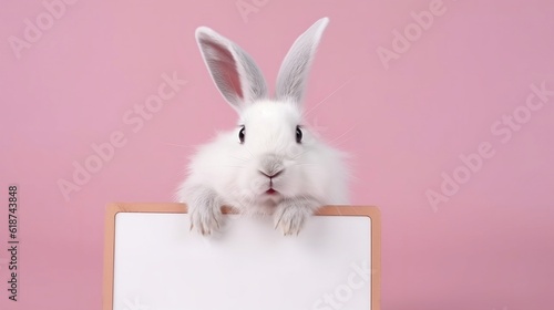 Rabbit holding up a blank whiteboard on isolated pastel color background, generative AI