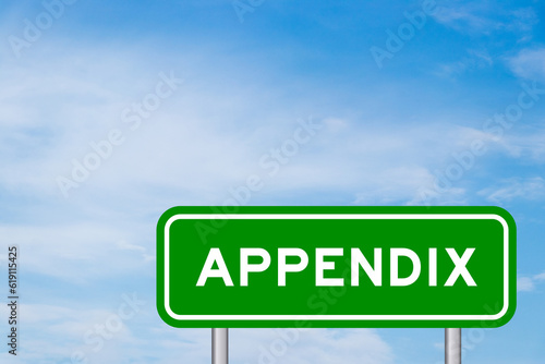 Green color transportation sign with word appendix on blue sky with white cloud background