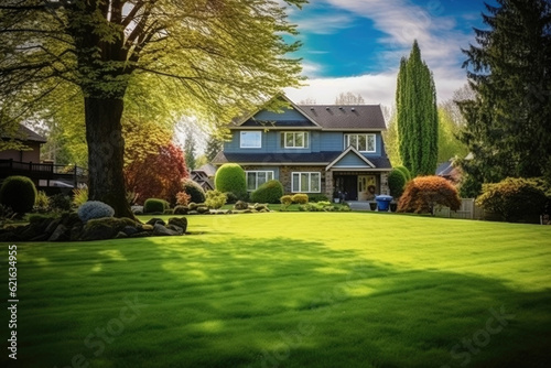 Traditional american house facade in suburb. Facade of old family house with lawn and backyard. Real estate and private property. Created with Generative AI