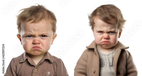 fictional portrait of a frustrated angry grumpy upset toddler kid on transparent background