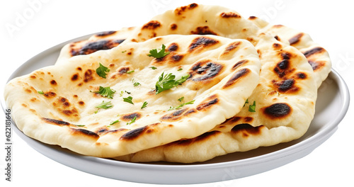 Indian naan bread with garlic and butter, Pita bread on a white background. Generative AI