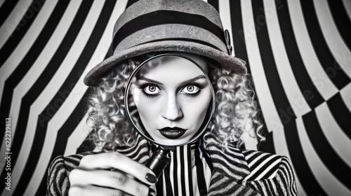 Young woman in detective costume playfully explores with a large magnifying glass on a checkered backdrop. Generative AI