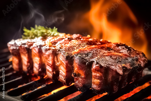 BBQ smoked ribs with dark background. Juicy dripping grilled ribs with smoke and fire.