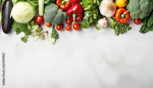 Fresh vegetables on white marble background. Healthy food concept. Top view, copy space