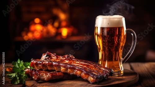 Glass of beer and grilled pork ribs with rosemary on a wooden board. Copy space. Generative AI