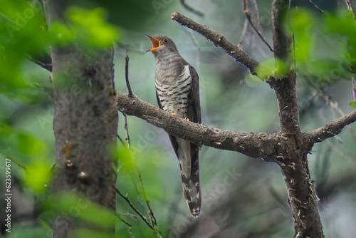 木の枝にとまり囀るホトトギス