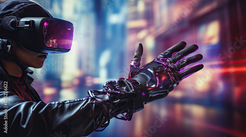 Haptic VR glove against a futuristic interface. Generative AI